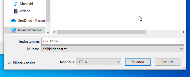 Jos ja kun koitat html-koodausta omalla koneellasi, niin sinun täytyy tallentaa html-tiedosto .html-päätteen kanssa. Kun tiedostossa on .html-pääte, niin sen voi avata selaimessa tuplaklikkaamalla sitä. Tiedostosta tehdään html-muotoinen niin, että kun tallennat tiedoston tekstieditorissa, valitse Muoto-valikosta "Kaikki tiedostot" ja lisää tiedoston nimeen .html-pääte: